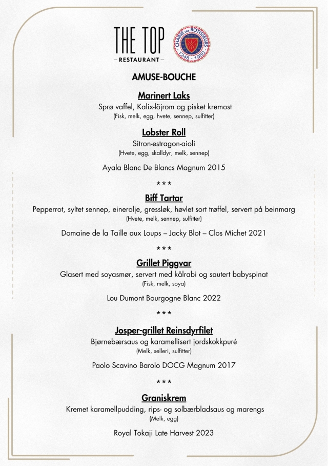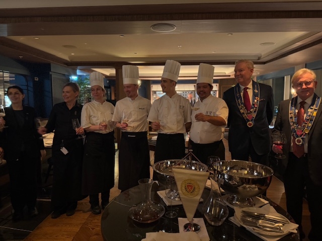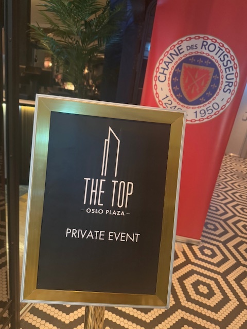 Bailliage Régional d'Oslo hadde gleden av å invitere til en flott og velsmakende kveld med fantastisk utsikt over Oslo. Hotelldirektør og Commandeur, Tarje Hellebust, og hans sorte og hvite brigade hadde tilrettelagt for en utrolig velsmakende og flott kveld i et stilig chambre séparée. Bailli régional Toril Flåskjer ønsket velkommen under apéritiffen og dertilhørende amuse bouches, før 29 medlemmer og 10 gjester gikk til bords.
