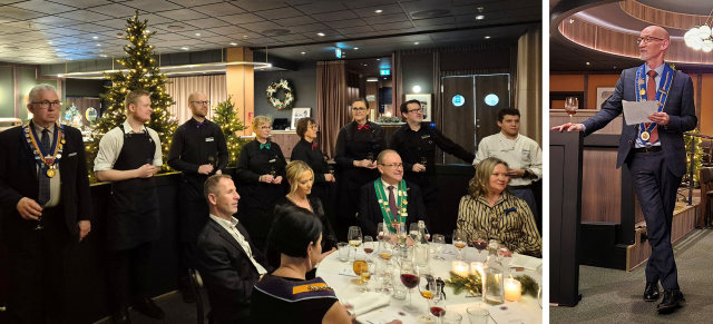 Kveldens matomtale ble holdt av Chargé de Presse Albert Verhagen. Han startet med en stor takk til hele teamet på Royal Garden for en gjennomført helhetlig opplevelse, fra første steg inn døra. Da han kom til Norge for mange år siden, møtte han lutefisk som noe av mest særnorske han kunne forestille seg. Ofte fulgte også den velkjente unnskyldningen: «Det er tilbehøret som gjør det godt.» Denne kvelden var det ikke nødvendig med noen unnskyldning. Lutefisken var delikat, fast og riktig tilberedt, med tilbehør som gjorde akkurat det tilbehør skal: støtte, ikke være et alibi. Med andre ord en lutefisk som viste hvorfor den fortjener sin sentrale plass i den norske julearven. Kveldens siste rett, en ‘mystery basket’ under en sprøtt krumkakelokk, samlet alt vi liker med førjulskvelder: varme, sødme og feiring i godt selskap. Sjokolademoussen ble servert med en av Torfinns favoritter, en nydelig sterkvin fra Portugal. Albert avsluttet med å takke teamet ved Royal Garden igjen for en strålende innsats gjennom hele kvelden, og for å løfte en tradisjonsrik lutefiskaften inn i en moderne og velkomponert opplevelse, preget av profesjonalitet, generøsitet, ro og ekte gjestfrihet. Gjestene var helt enige, og ga den hvite og sorte brigade en velfortjent stående applaus.