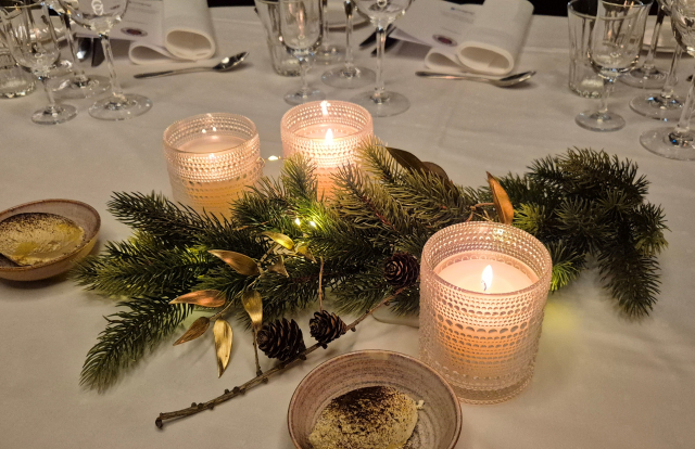 Deretter tok vi plass rundt vakkert dekkede bord, med elegant julepynt og rikelig med levende lys. Vice-Chancelier Argentier Hege Jullumstrø Hildonen ønsket velkommen på vegne av la Chaîne des Rôtisseurs og ga en ekstra varm hilsen til tre nye medlemmer i fellesskapet. Med godt over tre hundre medlemmer, hvorav 25 nye i 2025, er Baillage de Trøndelag fortsatt størst i Norge, med høy andel profesjonelle og mange medlemmer under 35 år. Så gikk ordet videre til Maître Hôtelier Tone Hansen, som ønsket oss hjertelig velkommen til Royal Garden. Assisterende kjøkkensjef Krister Olsen ledet oss videre gjennom en spennende julemeny, som hadde også tatt høyde for gjester som var litt skeptiske til lutefisk. Med et lite glimt av diplomati fikk disse servert pinnekjøtt i stedet. Til slutt presenterte Vice-Echanson Torfinn Lerstad det store utvalget av drikke vi skulle få gjennom kveldene. I motsetning til den kjære tradisjonen på Royal Garden ble champagnen denne gangen skjenket fra vanlige flasker, ikke Magnum. Det fikk han skylde på en litt for populær champagnebar de nylig hadde under World Cup.