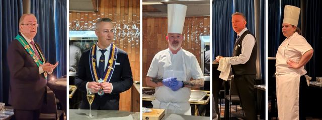 Årets siste Dîner Amical i Baillage de Trøndelag ble holdt på Scandic Nidelven. 74 forventningsfulle gjester ble mottatt i det totaloppgraderte og nyoppussede buffetområdet, som nesten tok pusten fra de fleste. Her blir det etablert flere stasjoner med åpen kjøkkenøy, eget bakeri og intet mindre enn en juvellignende Ambach komfyr importert fra Italia. Hele området er designet for å fungere like godt på dagtid som på kveldstid. Blant annet kan kaffebaren forvandles til en fullverdig bar. Mens vi lot oss imponere over de nye lokalene, ble det servert champagne fra ekstra store flasker, deilige østers og nyskåret parmaskinke av ypperlig kvalitet. Deretter fortsatte kvelden inne i Broen restaurant, der gjestene tok plass rundt vakkert dekkede bord med elegante, høstinspirerte blomsteroppsatser.