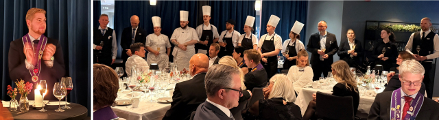 Kveldens matomtale sto et av Trøndelags unge medlemmer, Chevalier Robin Hjelseth, for. Han åpnet med å gi den hvite og sorte brigaden en velfortjent applaus for en strålende kveld. Deretter roste han de flotte kombinasjonene av mat og utsøkte vinene. Hovedretten, and – som er hans personlige favorittmat – beskrev han som rett og slett magisk. Han trakk også fram ostetrallen, med fire fantastiske oster og gode marmelader som ble servert som delemat på bordene. Her sa han seg helt enig med Lars Erik at litt «arm over bordet» og fat som sendes hit og dit løfter stemmingen rundt bordene og gir den gode, uformelle tonen vi liker så godt. Til slutt fremhevet han den silkemyke sjokolademoussen som sammen med et glass deilig Royal Tokaj satt et perfekt punktum på en kveld fylt med god mat, godt drikke og usedvanlig god stemming. Gjestene kunne ikke vært mer enige. De reiste seg, løfte glassene og ga den hvite og sorte brigade en velfortjent stående applaus som takk for en uforglemmelig førjuls kveld.